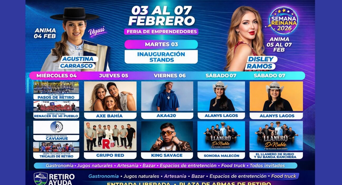 Entre el 3 y el 7 de febrero, la Plaza de Armas será el epicentro de una celebración cultural y familiar que reunirá música, tradición, emprendimiento local y destacados artistas nacionales, con entrada liberada para toda la comunidad. La comuna de Retiro se prepara para vivir una nueva versión de la Semana Retirana 2026, una […]