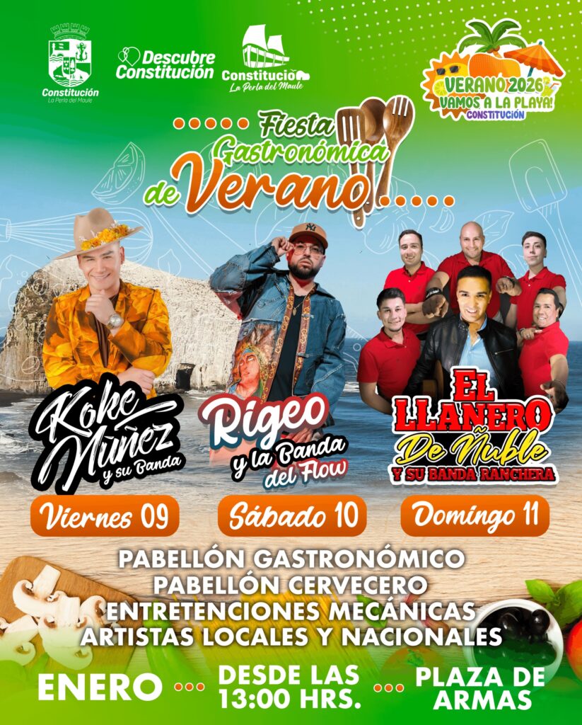 La Municipalidad de Constitución extendió una invitación abierta a la comunidad y a quienes visitan la ciudad a ser parte de la Fiesta Gastronómica de Verano 2026, una imperdible celebración que se desarrollará los días 9, 10 y 11 de enero en la Plaza de Armas, consolidándose como uno de los principales panoramas estivales de la comuna.